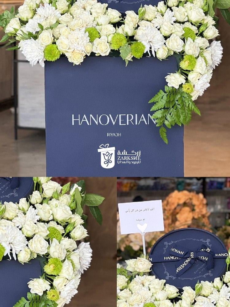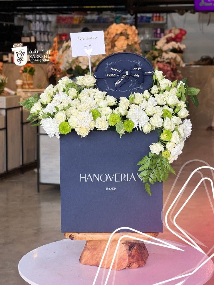 باقة ورد مع شوكلت هنوفريان تجمع بين ألوان الزهور الزاهية ونكهة الشوكولاتة الفاخرة مما يجعلها الخيار المثالي لكل المناسبات كما إنها تعبير رائع عن الحب والتقدير وتضفي لمسة من السعادة والأناقة على أي مناسبة ويتغير لون العلبة وفقًا للإصدارات الشهرية لHANOVERIAN لتكون كل هدية فريدة من نوعها.